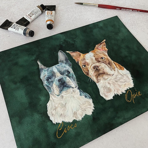 For these two Boston Terriers, it was probably a little over halfway through the beginning phase of painting the fur that things were looking rough. I remember thinking, "Oh no. Did I go too strong with the blues on this dog on the left?"